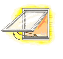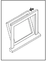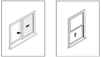| Casement A casement window opens from the side.The opening hardware is usually installed at the bottom of the window.This hardware can block an escape. Make sure you measure the opening just to the hardware so that you know how big the opening really is.Casement windows usually have latches opposite the hinge. Children should be able to reach these latches if they are expected to escape on their own. Hinge hardware may allow the window to pivot around an axis at or near the jamb. The opening must be large enough, even with the opening hardware blocking the opening and the window fully open.