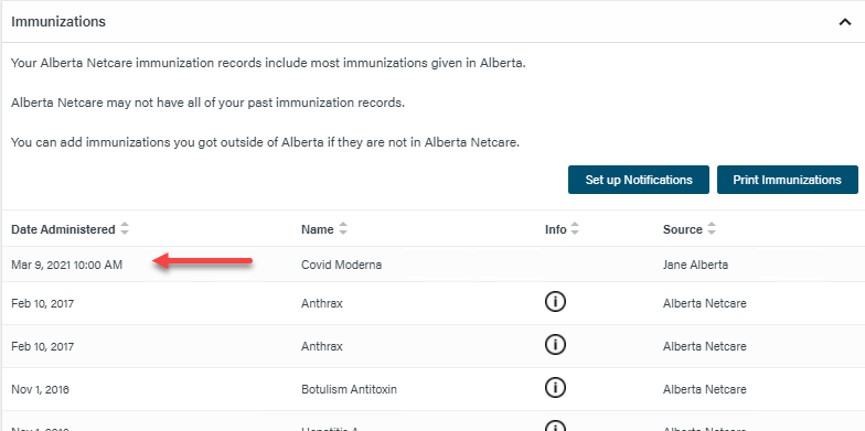 The Immunizations tool helps you keep track of all your immunizations delivered by Pharmacists and public health services in Alberta. This information is updated frequently.
