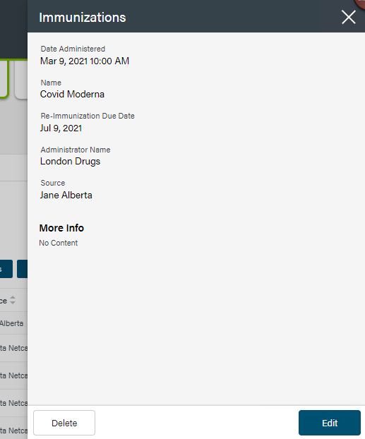 By clicking on an immunization in the list, you have the ability to edit or delete it. Please note that this only applies to immunizations that you have added.