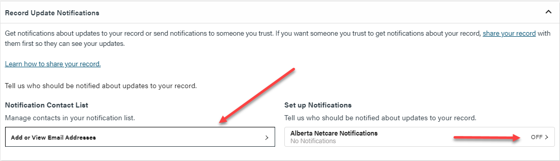 allows you to receive updates about your Immunization record or send notifications to someone you trust. If you want someone you trust to get notifications about your immunizations, share your record with them first so they can see your updates.