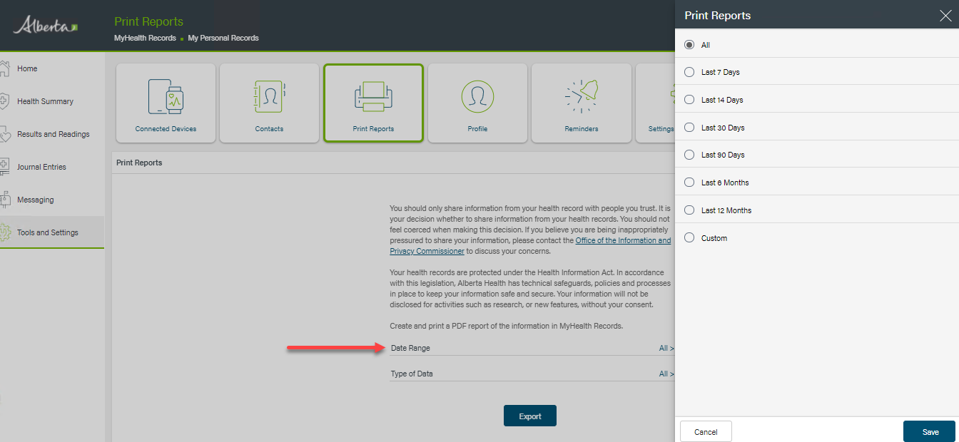 Click on “Print Immunizations,” select your preferred date range (all days or anywhere between 7 days to 12 months), and save your selection.