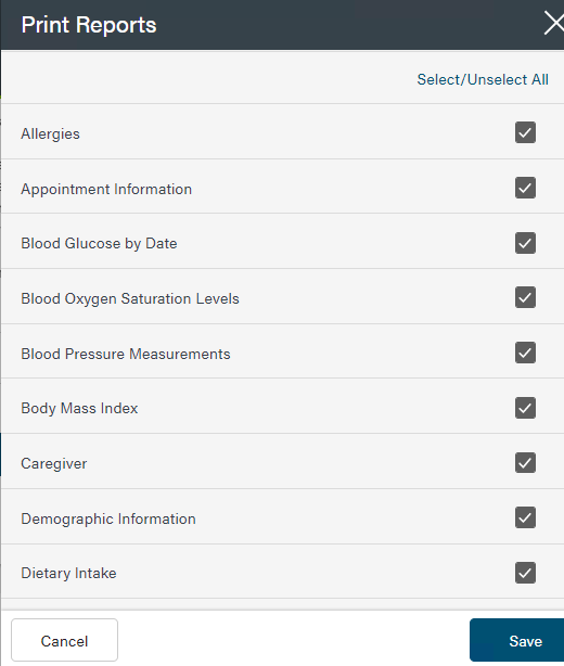 You can also select what type of information you want to see printed on your report (allergies, appointment information, blood glucose, etc.)